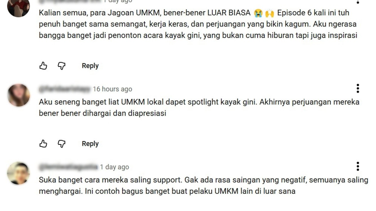 Banyak penonton mengaku terinspirasi oleh semangat dan keteguhan para pengusaha UMKM yang menghadirkan kisah perjuangan nyata penuh emosi dan motivasi terlihat dari kolom komentar YouTube Shopee Indonesia yang dipenuhi ungkapan dukungan dan apresiasi dari netizen.
