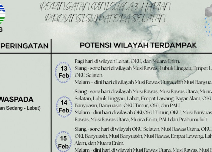 "Peringatan dini cuaca di Provinsi Sumatera Selatan selama beberapa hari kedepan berpotensi hujan dengan intensitas sedang hingga lebat disertai kilat, petir, dan angin kencang," katanya.